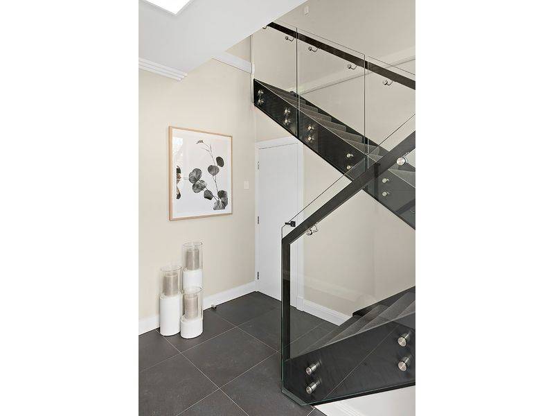 Statement Staircase with glass balustrade fixed with stainless steel buttons, timber handrail creates a sense of light, openness and space